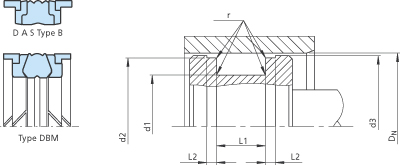 三个密封唇都位于外径上。两个外端密封唇作均附加性密封'中间密封唇是较宽的,并且是主密封唇。在密封圈的内径处(静密封).与沟槽底径的接触面是比较宽的。在每边安放一个挡圈对弹性体进行支承并防止其挤出。这种有台阶的挡圈可防止密封件在运行时产生旋转。